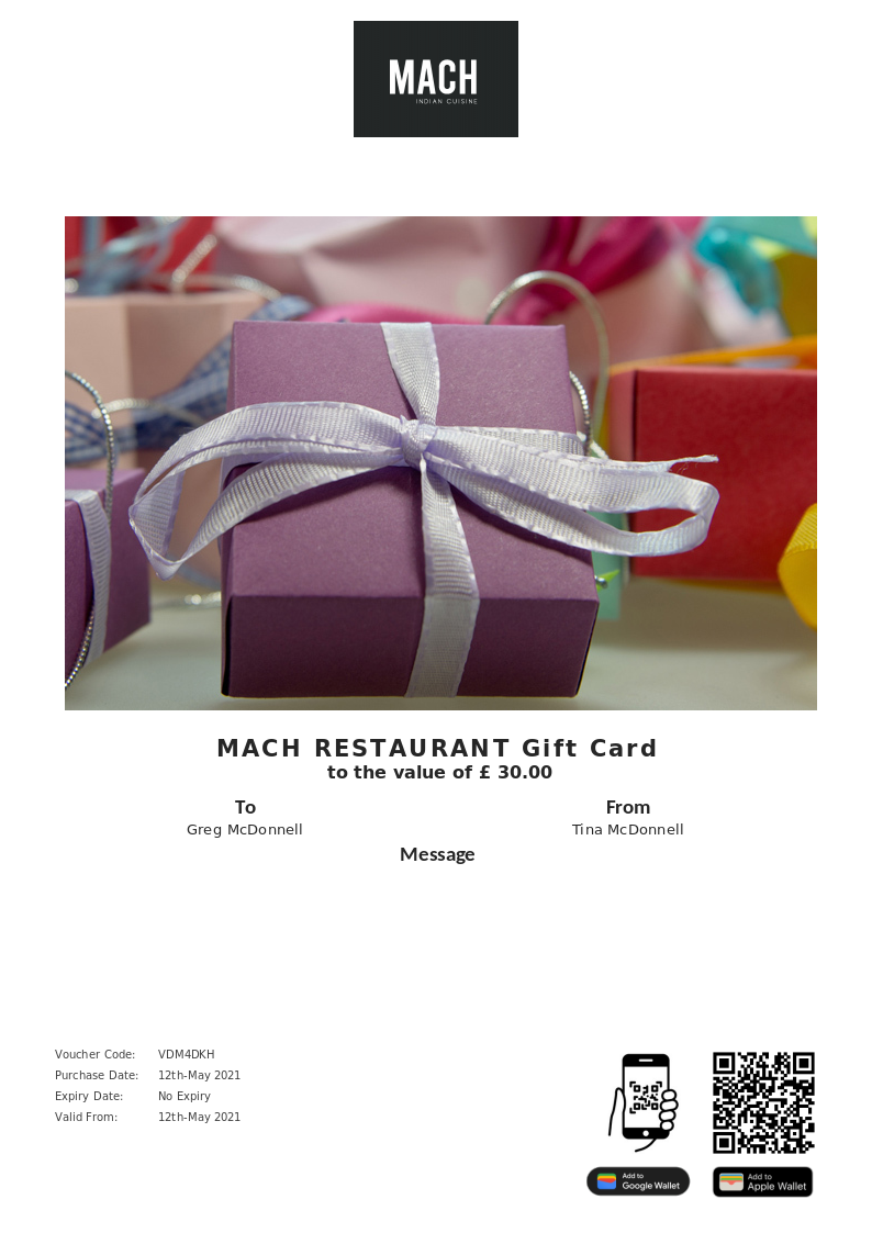 MACH RESTAURANT allows you to purchase instantly printable gift vouchers, special offers and tickets using the Voucher Connect platform.